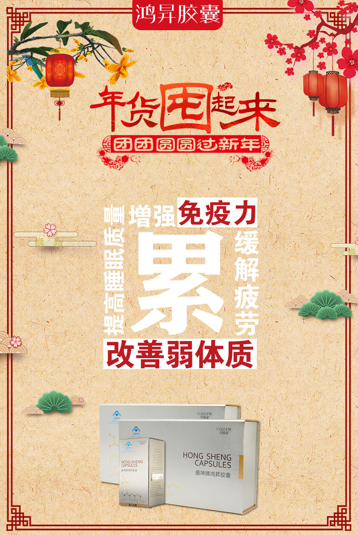 团团圆圆过新年,红红火火囤年货~转眼又到年末,送礼首选鸿昇胶囊,增强免疫力,改善弱体质~1月17日10点整,买2套送1瓶准时开抢~