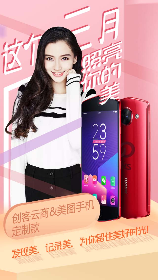3月末的大动作,创客云商携手美图手机,跨界合作打造创客专属的定制版手机。我负责变美,它负责展现,这种组合,你期待吗? (PS: Angelababy是美图拍照手机代言人哦~)