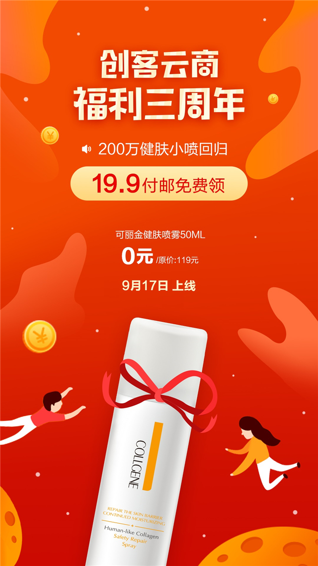 原价¥119的50ml可丽金保湿、修复、抗敏喷雾,三周年店庆付邮费¥19.9即可抢购,每人均有一次名额。抢完后分享,还能抽奖品,得现金券!! 200万支开始放送,你有几个微信号,就可以抢几只,拿起家人、朋 ...