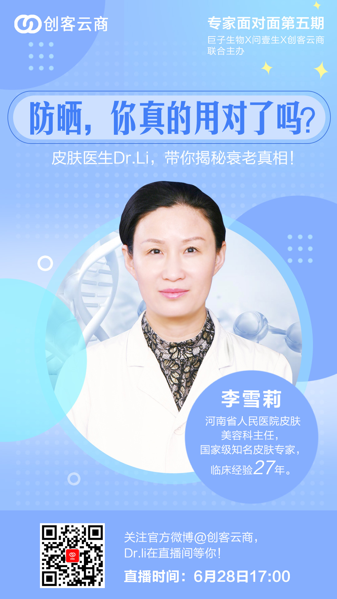 夏天防晒多久补涂一次才科学? 涂了防晒为什么还会晒黑? 晒伤了怎么办? 对防晒有疑问的宝宝们,今天下午5:00李雪莉医生为大家逐一解答,关注创客云商官方微博观看! #可丽金# #创客云商# #类人胶原蛋白# ...